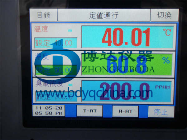 1.溫濕度和臭氧濃度儀表采用全進口韓國三元觸摸屏顯示儀,P.I.D微電腦S.S.R控制器;